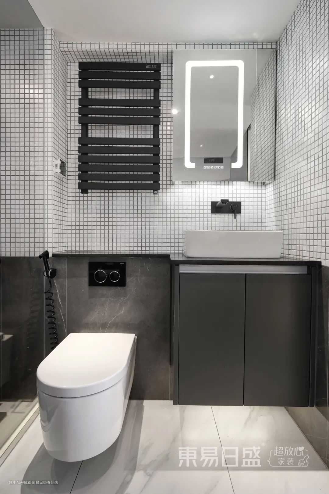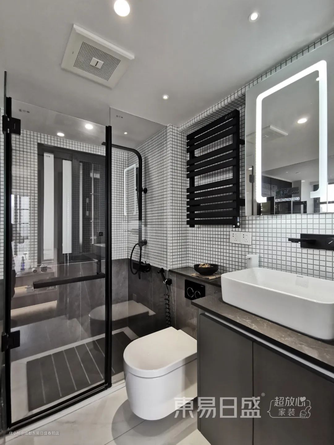 整个空间以深色瓷砖为主,采用内设双盆、淋浴房、马桶间、浴缸等组团式设计,体现了主人对生活品质的需求。