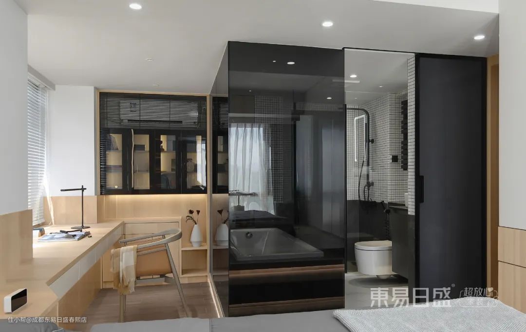 设计对空间进行打破重组,将空间规划为公共区域和私密区。公共区满足交流会客,就餐需求。私密区主要是卫生间,书房,卧室功能。卧室设计为台阶式榻榻米床,与飘窗做一个延伸。台阶式设计提供不同情境式的交流场景和视野,同时增加抽屉收纳。卫生间作为一个独立的盒子设计,打破传统的隔墙,改为黑色玻璃,强化区域界线的同时,也提供了视线交流的可能性。不同的空间呈现出不同生活情境,且能够视线无遮挡的交流沟通。