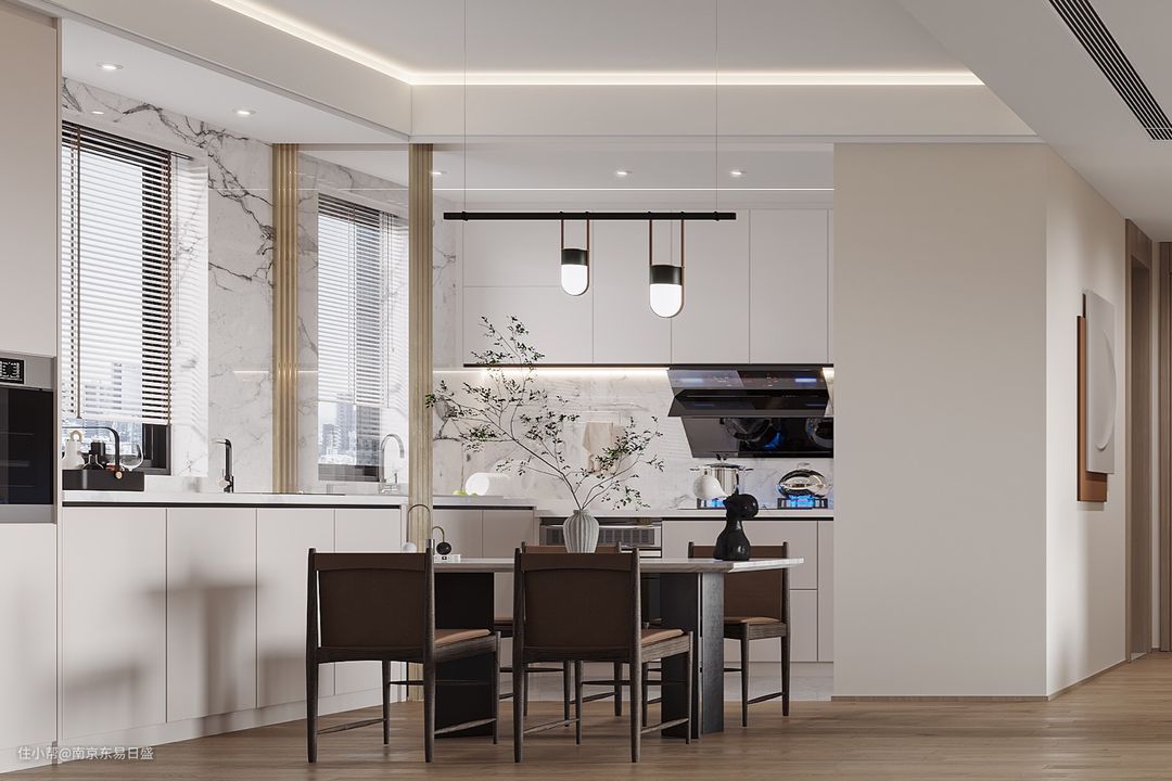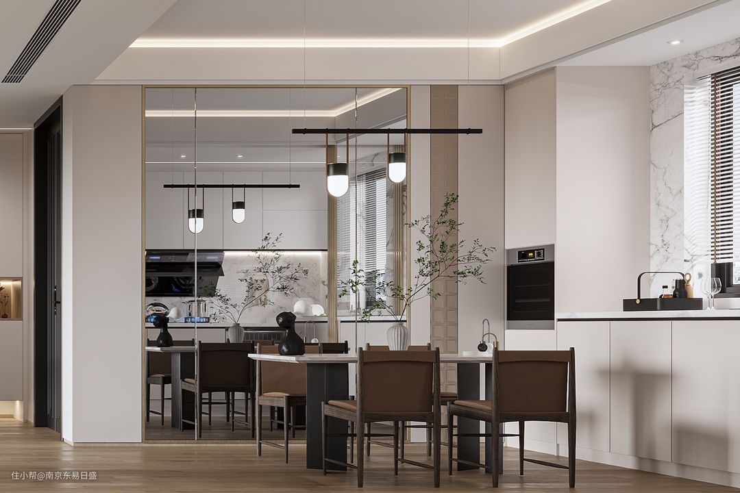 餐椅融入了大气的灰棕色,搭配白色大理石餐桌及整墙的餐边柜,呈现出干净、素雅的视觉效果,并散发着温润的质感。极简圆形灯饰有着十足的个性,使就餐环境温馨却不失趣味性。