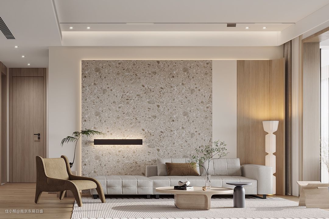沙发背景墙采用木饰面与米白色花砖相结合的方式,温暖而纯粹,令人一眼便感知到其中的细腻纹理。