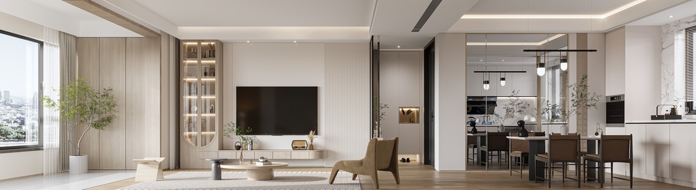 原木色家具的存在,让客厅更显静谧温柔,几株小叶绿植又为空间增添了几许趣味与灵动感。