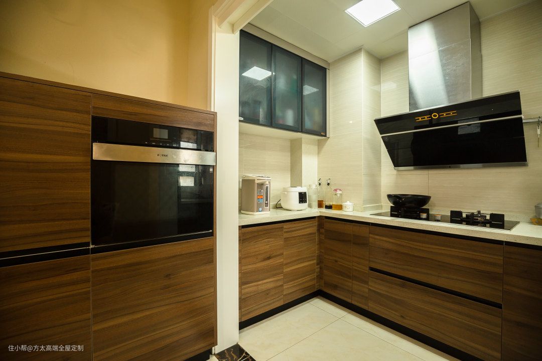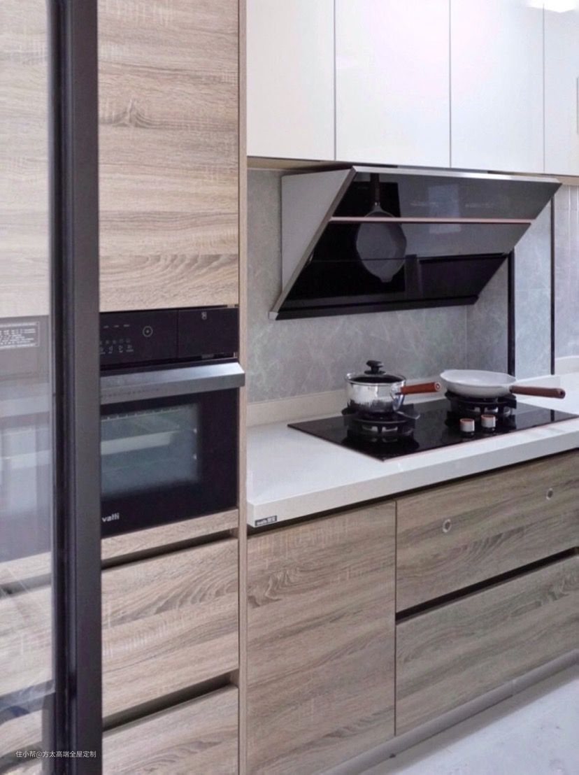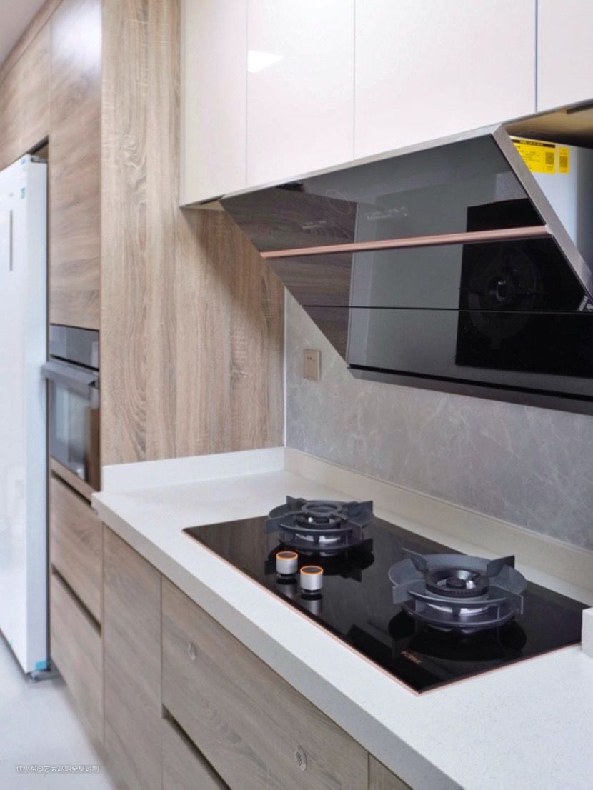要是你以为原木只能小清新,那就大错特错了!大面积浅色系原木的运用让厨房看起来高级的同时,又不乏情调和精致感,搭配上酷感十足的黑色厨电,是时下最流行的轻奢风没错了。