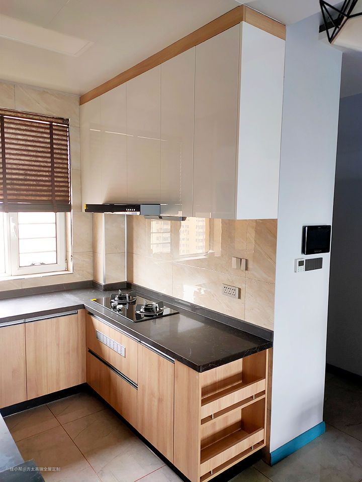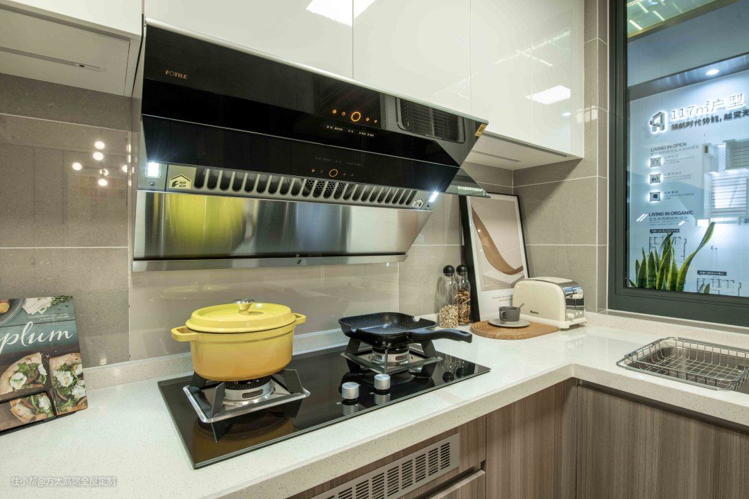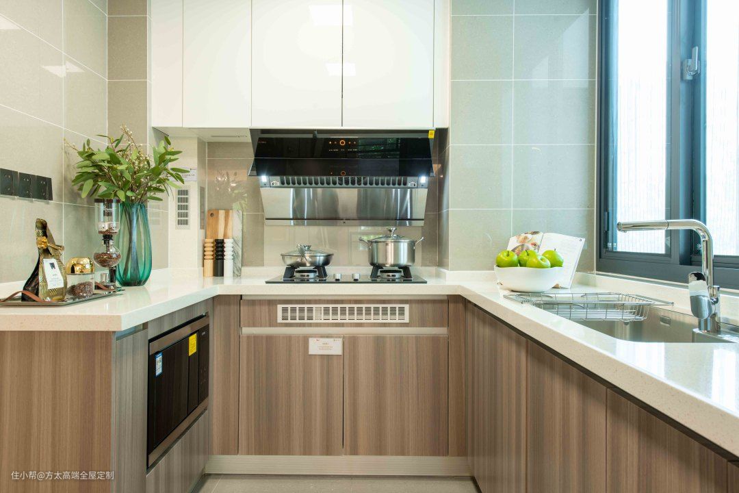 U型台面让操作空间更加充足,开放与封闭相结合的收纳设计让每一件物品都找到最佳去处,烹饪区充分利用纵向空间,让调料罐、锅铲等统统上墙,既看起来整齐划一,又实现了一秒取物。