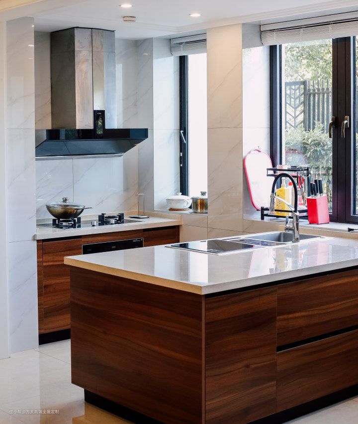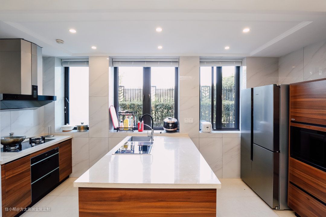 大大的中岛台是很多理想厨房的标配,既能承接各个功能区,又能营造开放式厨房的社交氛围,烹饪不再是一个人的事情,而是将家庭成员紧密联系在一起,其乐融融间尽享幸福生活。