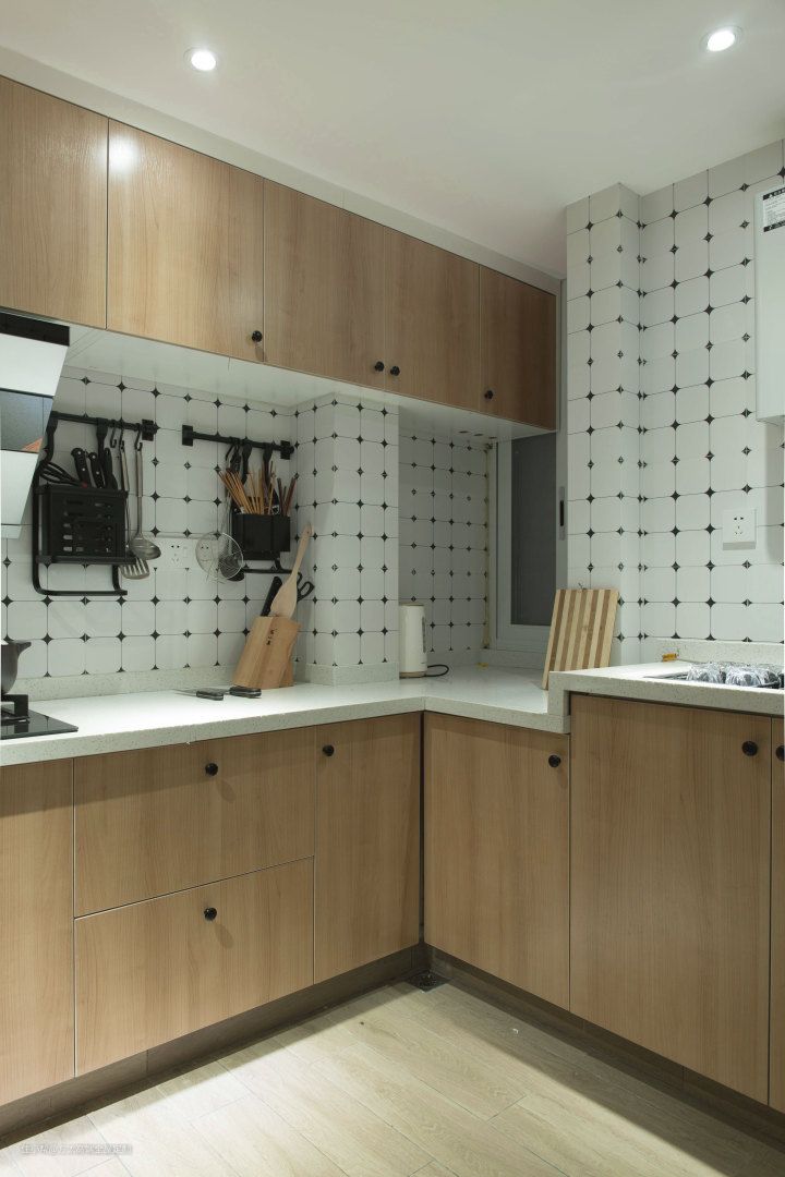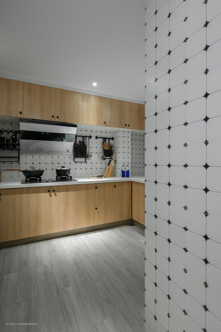 面积不大的小厨房尤其适合原木材质,与墙面上的黑点小白砖搭配在一起,可以有效地扩大视觉效果,看上去清爽洁净,避开面积缺陷,丝毫不会给人带来压抑拥挤的感觉。