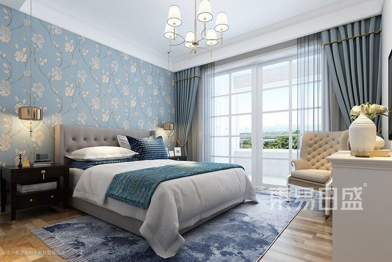 这一款效果图户型属于四居室,面积有144平米,采用了美式装修风格,整个设计比较雅致、温馨,床头背景墙选择了带花纹的浅蓝壁纸,与浅蓝的窗帘、深蓝地毯以及蓝色的床上用品相呼应,让整个卧室空间的色彩变得更为协调统一,通铺原木色地板,加上古典个性的吊灯,显得更加的高雅、舒适。