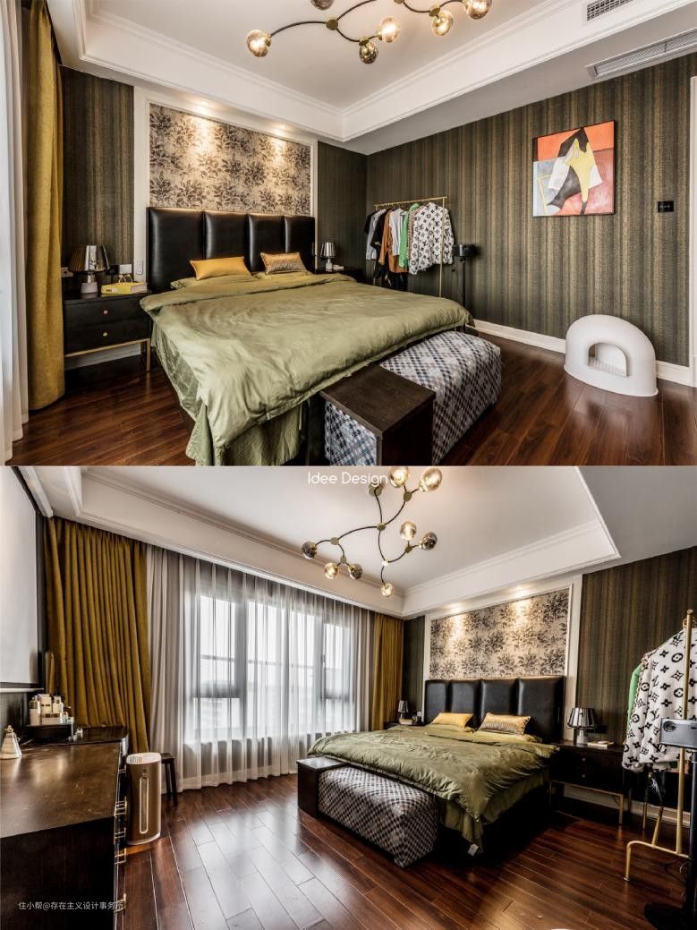 本案业主是时尚博主,印花床头背景墙凸显个性,原木地板搭配深色系家具,有现代轻奢元素也有美式元素,多种元素混搭毫无违和感,增加了整体的层次感