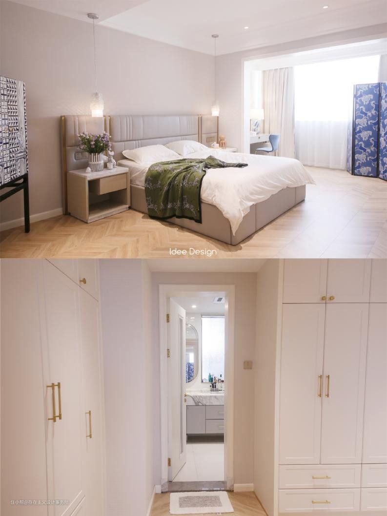 顶层复式的轻法式房间,将阳台封起来,搭配鱼骨拼木地板,扩大空间视觉,搭配法式屏风及斗柜点缀,多了一份温馨浪漫感,步入式衣帽间全白到顶衣柜包围,是每个女主人的梦想