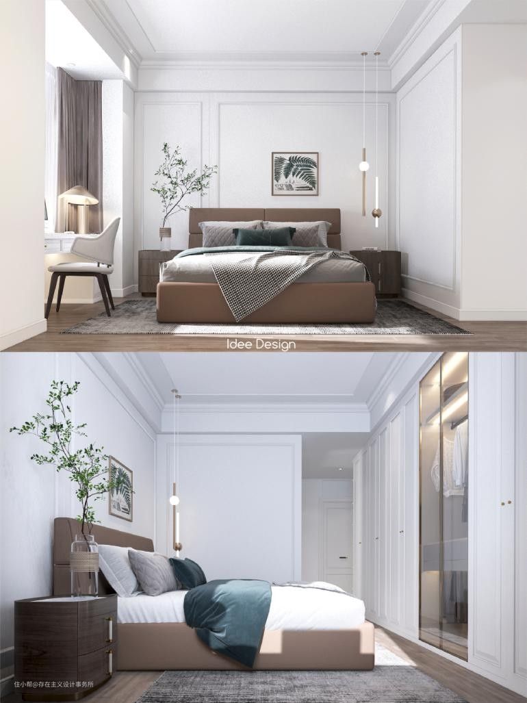 经典法式流畅线条勾勒出的层次美,优雅气质藏都藏不住。搭配棕色系家具,温馨自然,飘窗做成白色梳妆台,光线明亮,整面到顶衣柜,满足收纳需求,房间不大的可参考这设计