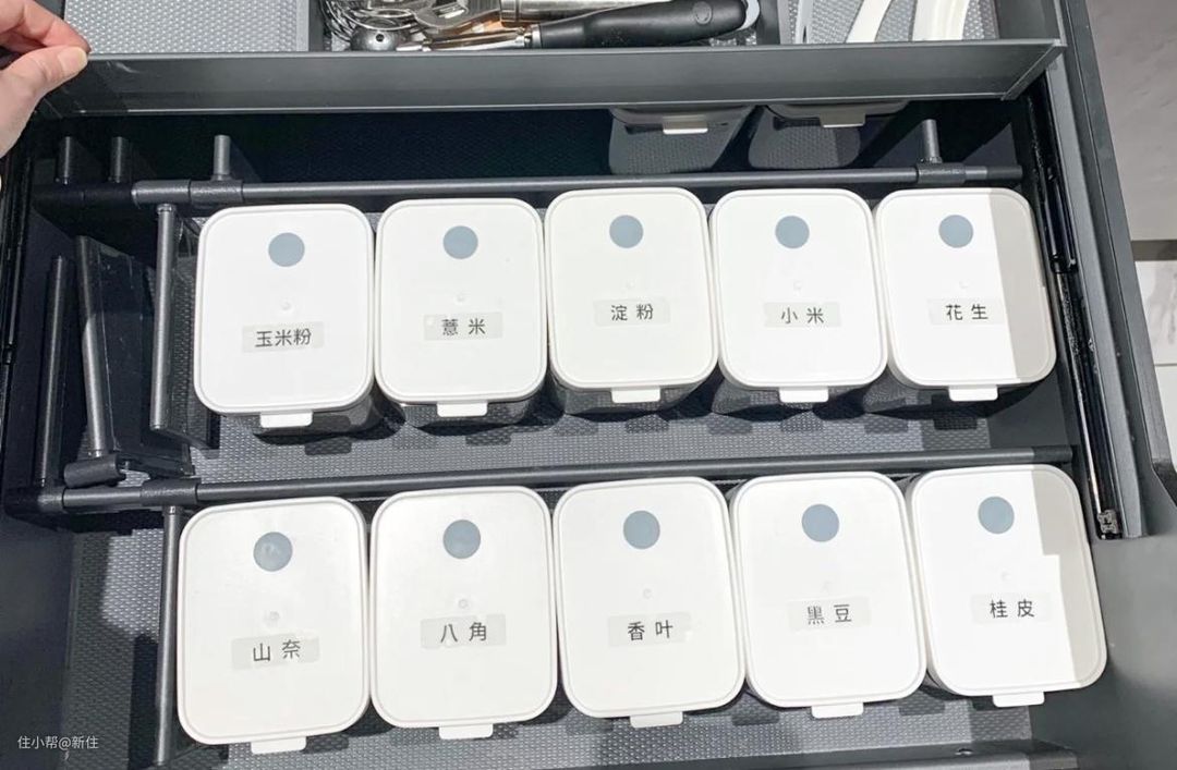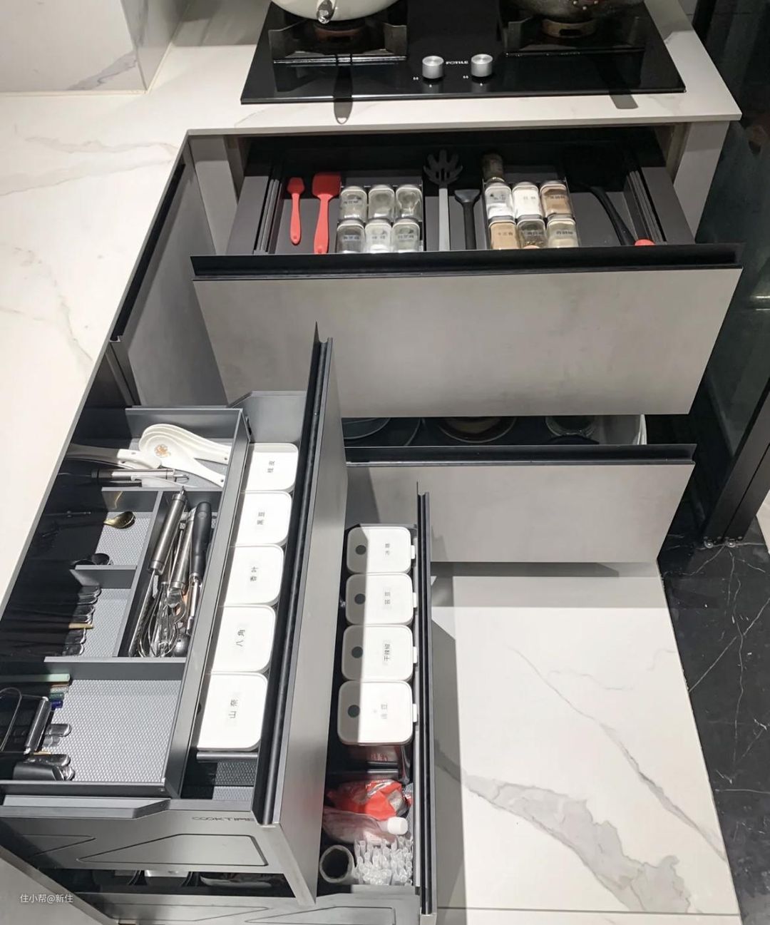 而像最让人头大的调味品收纳,现在也有专门的抽屉设计,大瓶的调味料、小瓶的调料等,都有固定的位置。