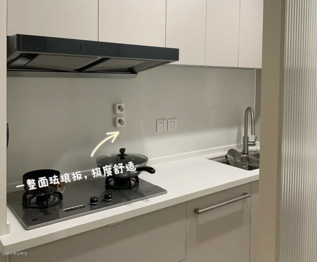 安装也很简单,提前预定好珐琅板尺寸,再根据墙面找平—打胶贴珐琅板—安装橱柜—安装插座步骤去操作即可,唯一就是价格略贵,进口的在千元左右/米,国产稍便宜些。
