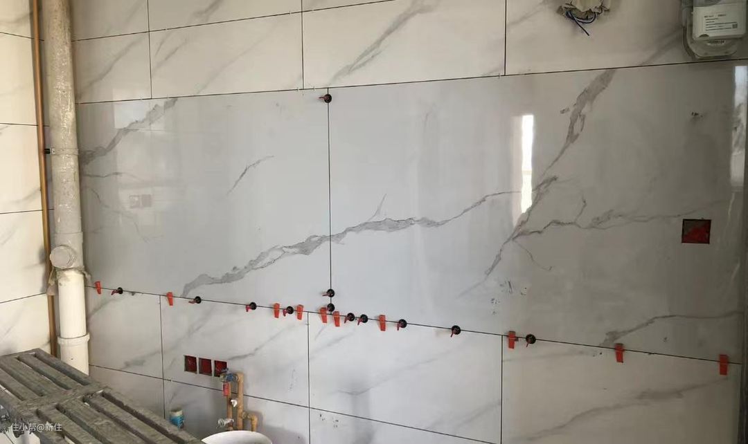 ②大砖上墙,一般吊柜和地柜的距离大概在60cm,刚好是60x120cm大砖的宽度,横着贴,可以满足最少缝隙的要求。