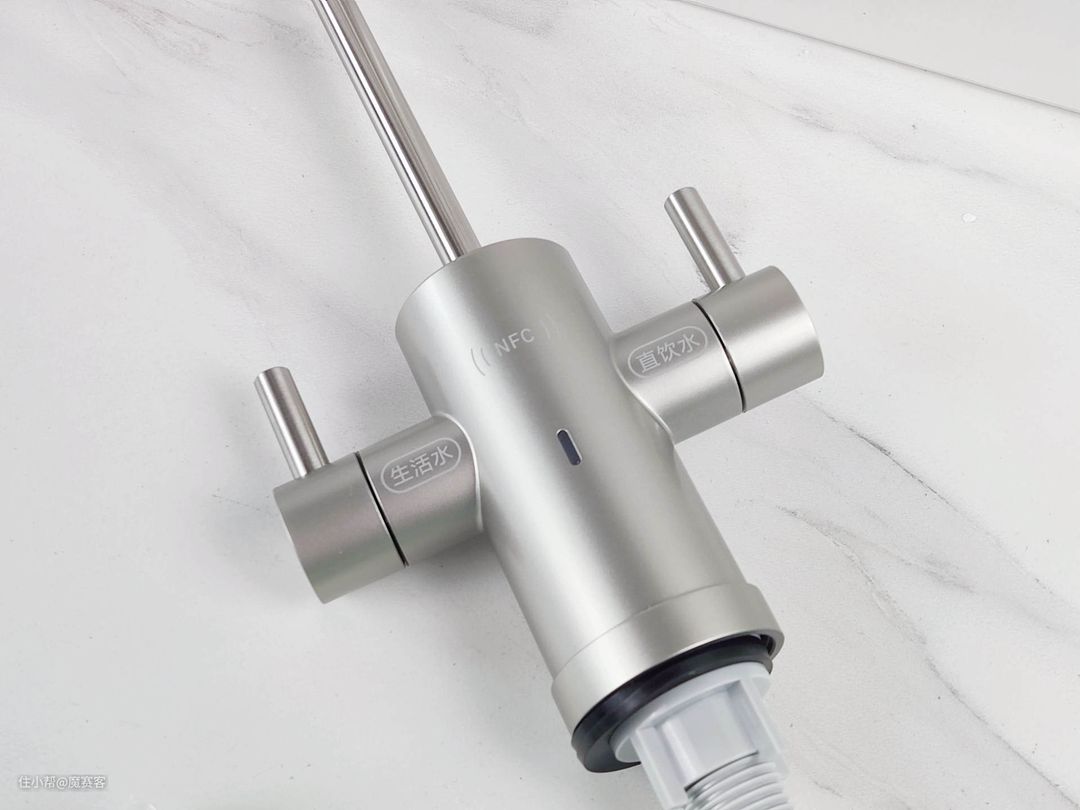 ▲水龙头上有生活水、直饮水、NFC的标识,如果看不清怎么办?没关系。打开直饮水的时候,工作指示蓝灯会亮起。