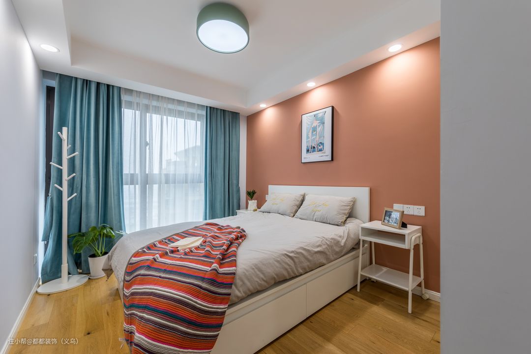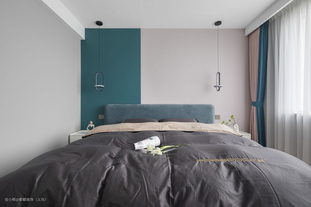 若是平涂的背景墙,就像在白纸上作画一样,可以是纯色的油漆,也可以是渐变的山水画,只要你敢想都可以在这上面呈现,在色调上有深沉复古的、也有清爽温馨的,乳胶漆的色彩建议采用淡蓝色、浅灰色、米白色等温柔的低明度色彩为主,有助于放松神经,有效助眠。