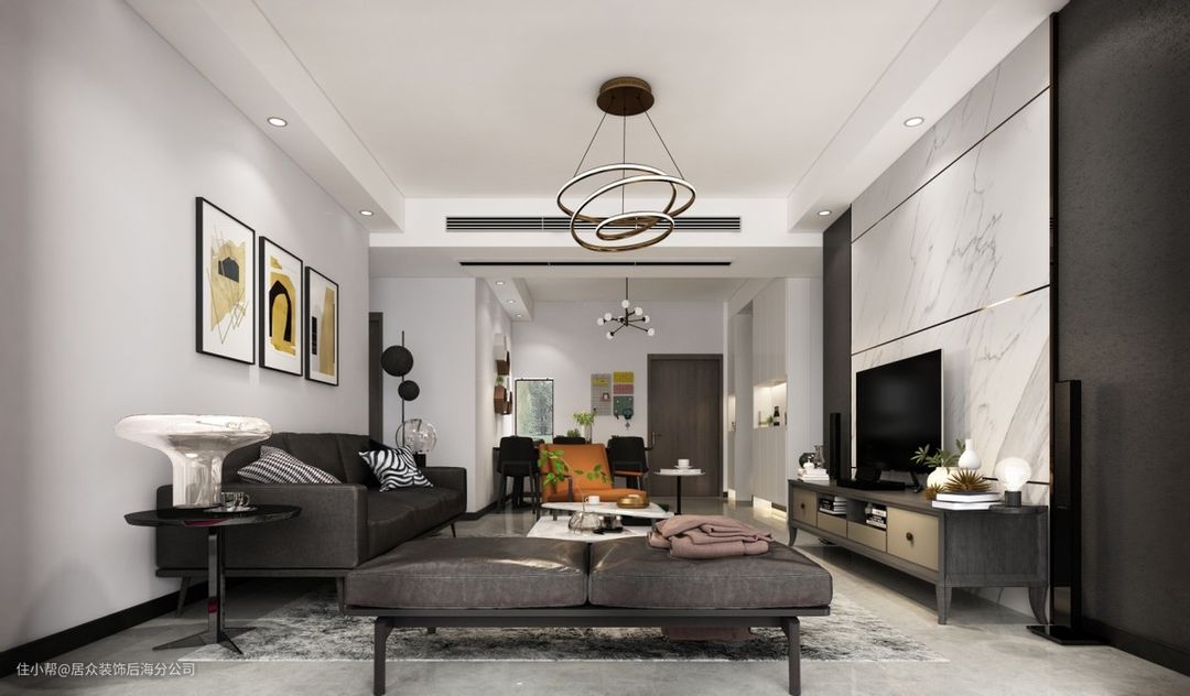 客厅比较大件的家具有沙发、茶几、地毯,可能还有成品电视柜、台灯等,在采用黑白色调搭配的时候,建议遵循“上浅下深”的原则,放置在高处的家具选浅色,放置在低处的家具选深色,上浅下深可以增加空间的稳重感,视觉上的和谐度更高。餐厅的餐桌椅,厨房的地柜与吊柜等也同样适用。