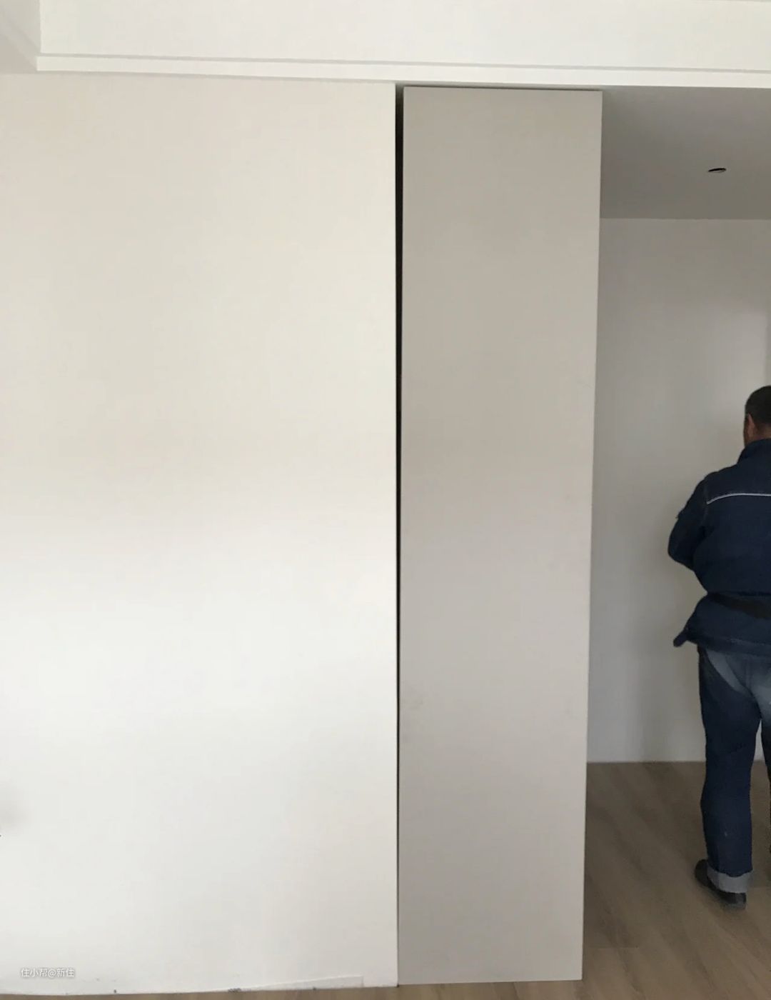 另外一种情况是,有封板的衣柜顶侧出现缝隙,这类型小的缝隙,可以通过木工调整顶侧封板厚度补救,不细看看不出来,稍微大的缝隙,只能同上了。