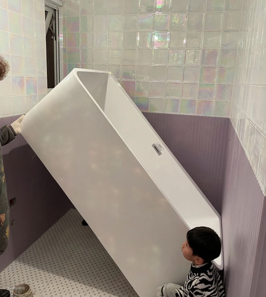 对于有包管柱的卫生间,明明可以选择刚合适的浴缸,在无包管处将浴缸摆好,再推进去,上图却按照包管墙距买的浴缸,导致缝隙过大,同样翻车了。