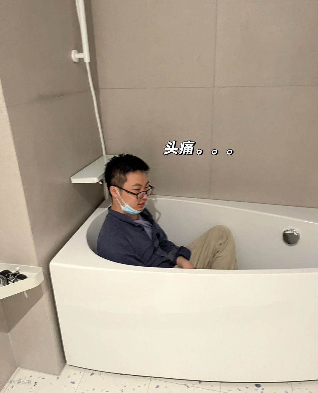 花洒距离本该不是能翻车的点,但像上图需要分方向的浴缸就得注意,要么把浴缸调整下头尾位置,要么买花洒时需要选择小于浴缸边沿宽度的花洒。