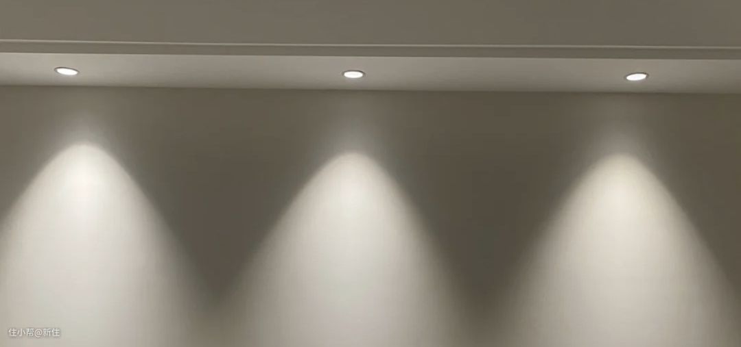 上图就是一个典型的灯光翻车案例,射灯离墙太近,出现一团曝光点,这样的灯光效果,没有一点美观高级感可言。
