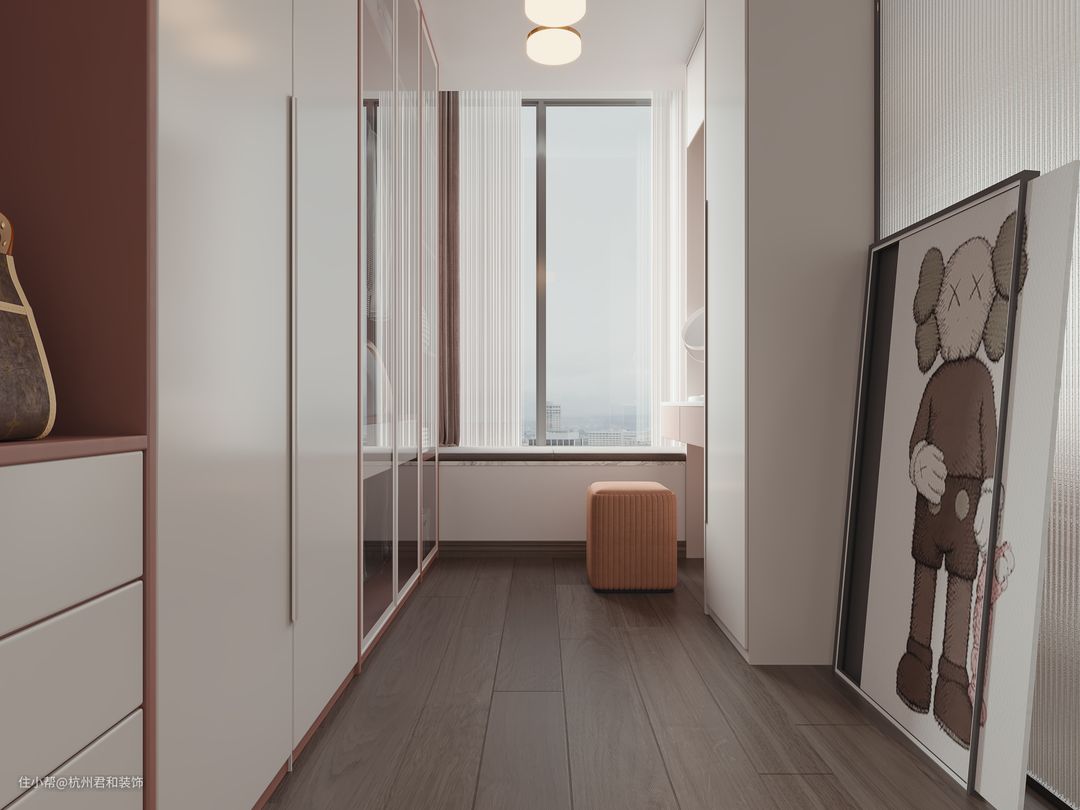 粉白配色的衣帽间,少女心满满,到顶的衣柜整体感更强,穿插玻璃门,让空间完整度更高,添加灯带,方便拿取,设置叠衣区、挂衣区、抽屉储存区,满足超大储物空间。