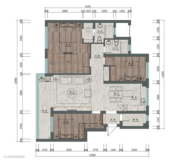 将原本的四室改为三室,打通衣帽间和主卧,打造套房式的主卧,使主卧的居住更加舒适。