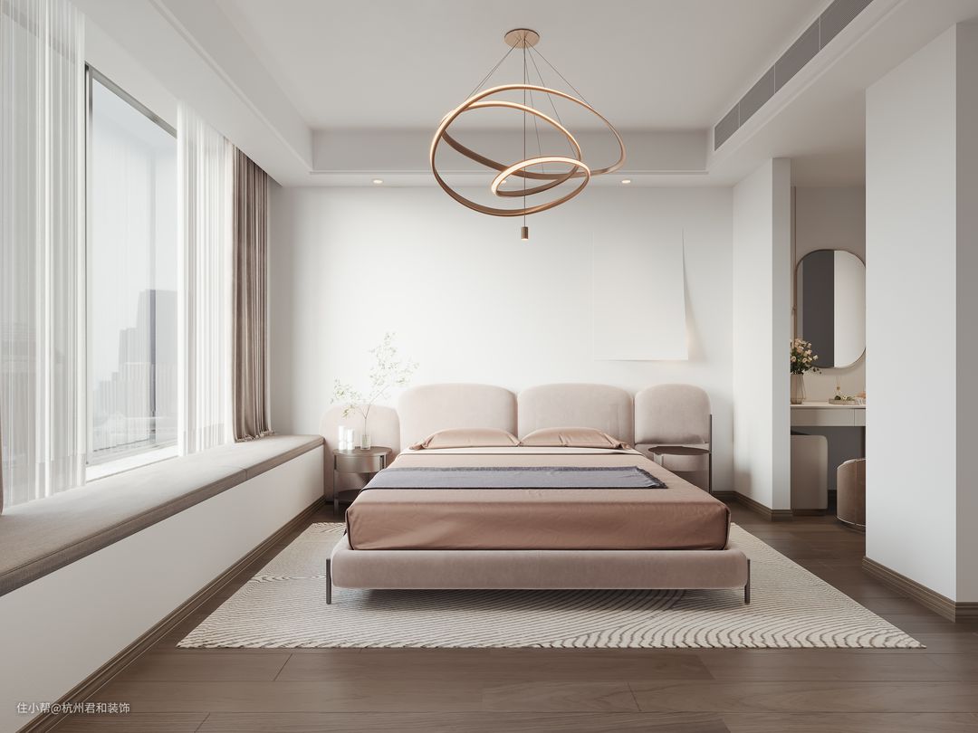主卧色彩清新明亮,床头的墙灯非常有设计感,就如掀开墙面的一角,借了隔壁的光。