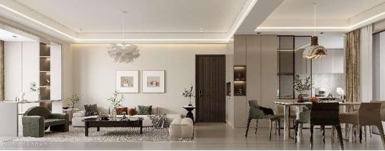 白与浅咖,浪漫优雅,柔软自在的沙发和简约系陈设。在满足功能的前提下,用温馨雅致的基调,让居者快速沉浸在与家人的沟通和享受之中。