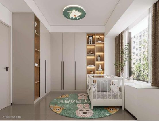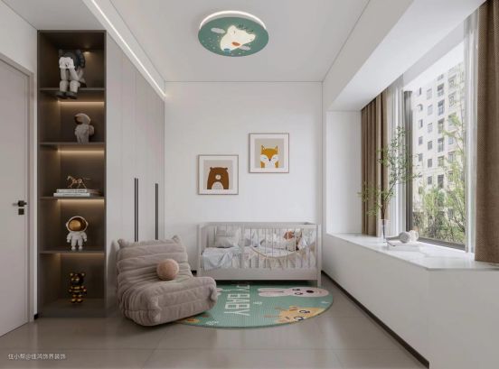 如果想要多一些储物空间怎么办?设计师给出了第二个方案:定制L型整面衣橱柜,宝宝的物品再多也能轻松装下,再将小床移至飘窗旁,天气好的时候,小朋友也能享受阳光的沐浴。