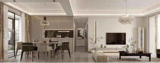 客餐厅以干净明亮为主基调,低饱和度的奶咖色系,表达对生活的包容和内心的柔软。