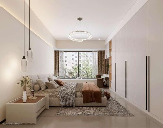 主卧以1.8米的床卧,整面的衣柜书桌和大面积的飘窗成就业主的典雅气质,纯白的空间里,布艺、木材、铁艺等不同材质相互碰撞,缱绻不已。