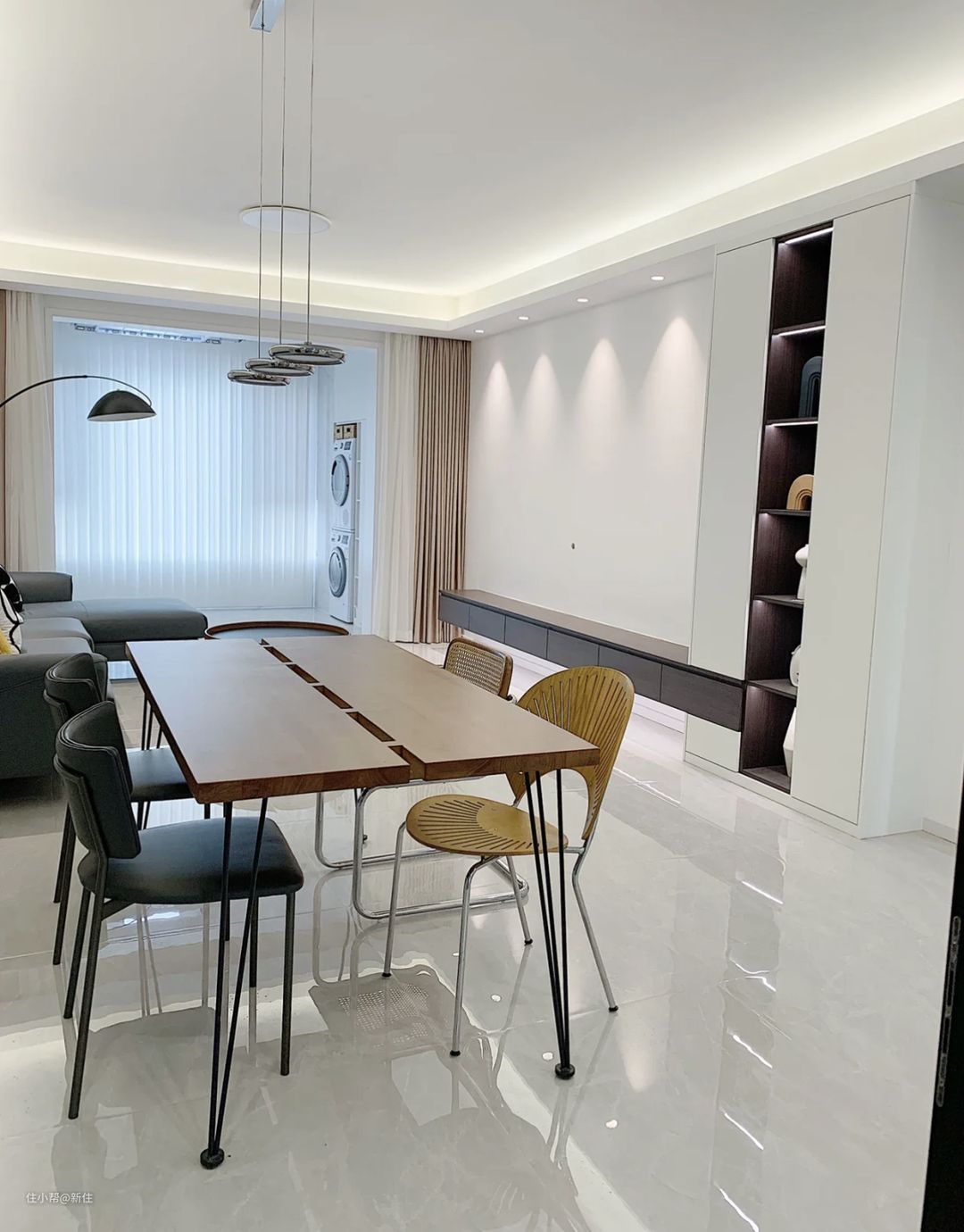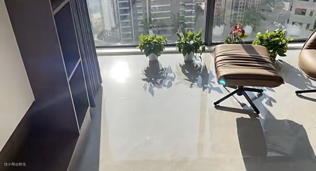 而到了晚上,这种光污染也难以逃脱,客厅灯一开,不仅头顶亮,地面也是各种灯光、家具倒影,看得人眼花缭乱。