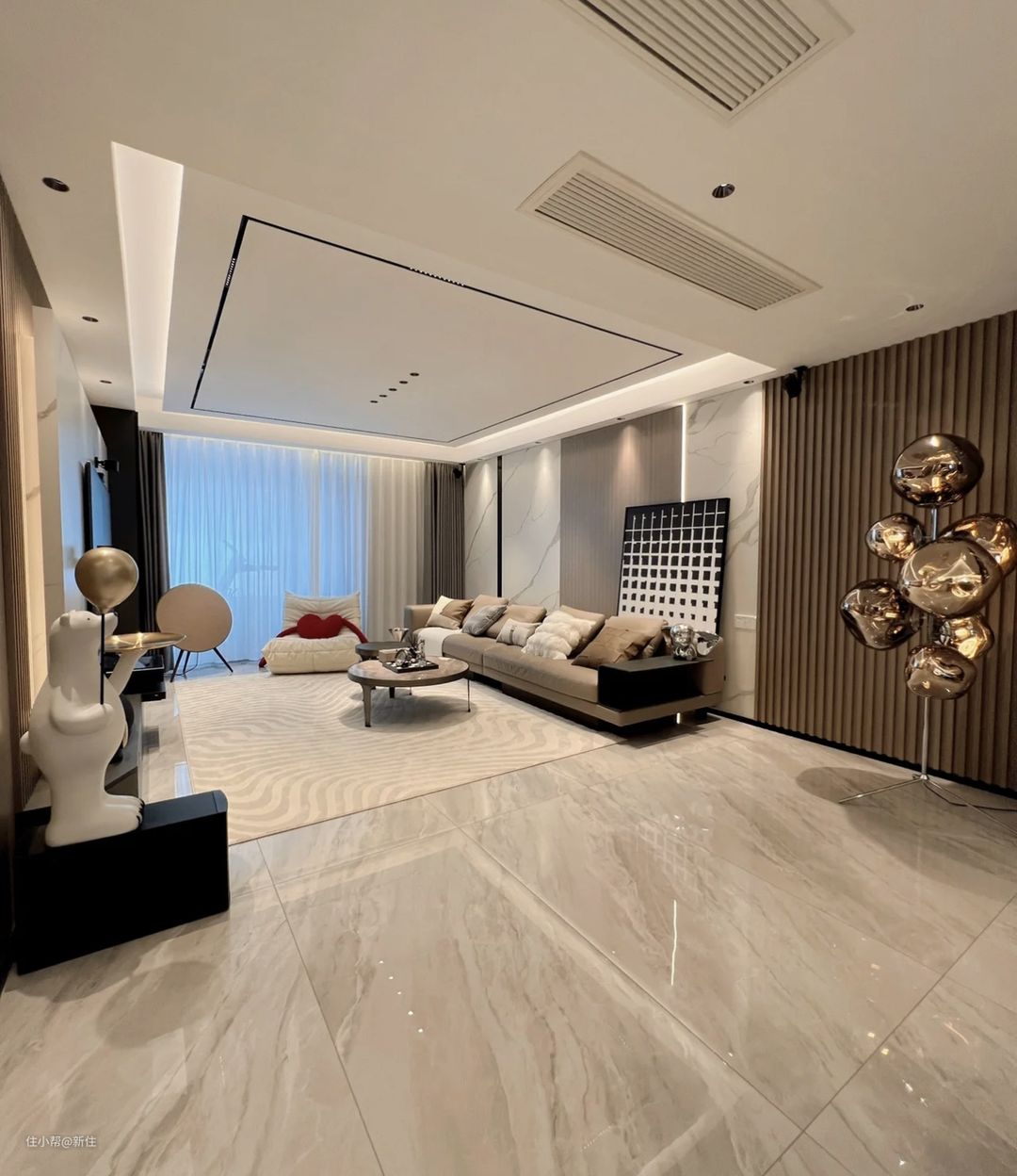 正面案例如下,顶部的线性灯光反射到亮面砖上,是一条直线,虽然光污染难以避免,但客厅的光线的曲律、整洁度是在线的。