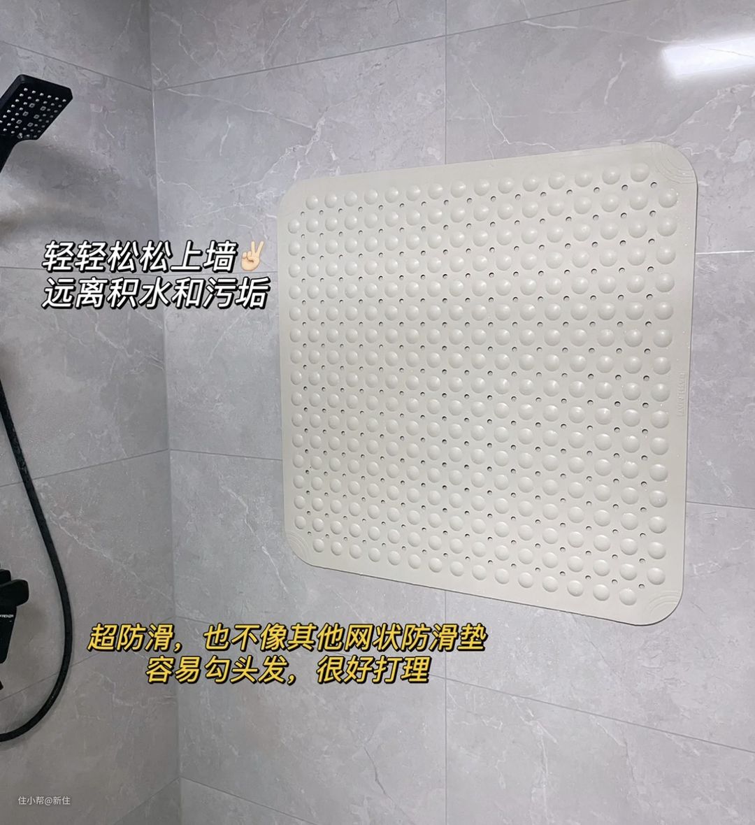 考虑到易用度及好打理程度,他选的是颗粒感稍强的防滑垫,能紧实的吸在地面上,自带大孔隙,排水性也好,用完了还能贴在墙面上,方便清洁卫生。