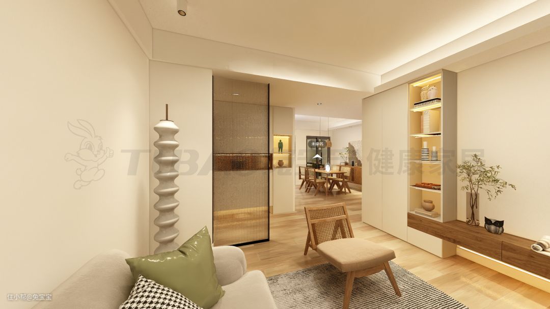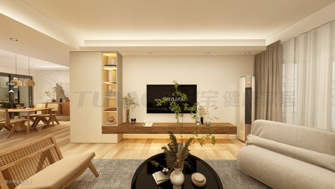 客厅是简约的L型电视柜,竖排的收纳柜延伸至转角,整体性更强。原木色一字型电视柜,与绿植一起点缀整体的白色空间,摆脱纯白带来的单调。