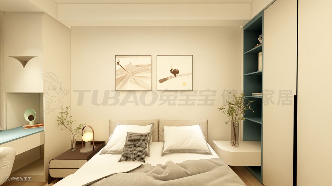另一个次卧的面积较小,只能容纳一个床头柜,更有打破对称带来僵硬之感的意味,是一种更灵活的美感。