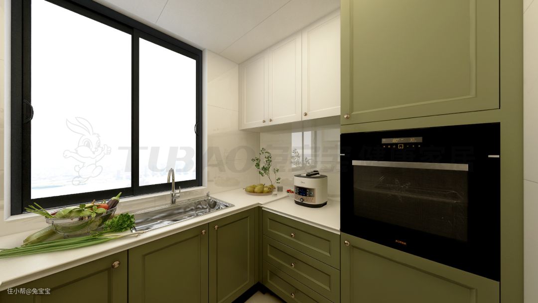 厨房内部的空间并不算非常宽敞,U形的橱柜布局满足日常的使用和收纳需求,青柠绿与白色门板组合,为空间增添绿色气息。