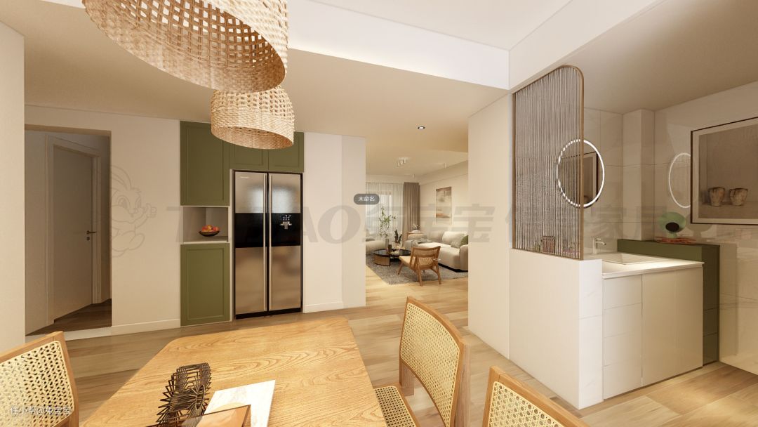 走廊面对餐厅一侧,定制嵌入式的收纳与冰箱空间,绿调的融入,令人恍若置身森林的情境,一抹绿调也为空间带入了复古的优雅气质。