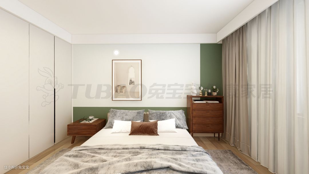 主卧室的装饰很简洁,双人床在中央位置,一侧的床头柜以斗柜替代,收纳效果更为明显。背景墙的绿色造型,丰满了整个简约空间,也与其他空间相呼应。