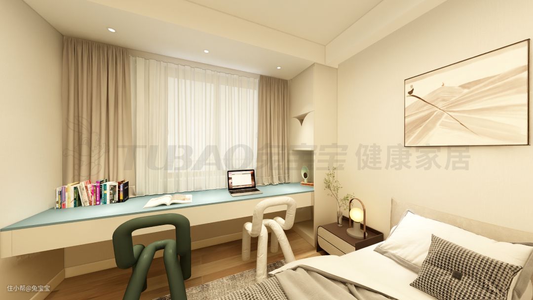 次卧靠窗定制长条形的隔板书桌,有大限度利用空间。书桌椅的选择独特又个性,同时也让工作氛围变得更轻松。
