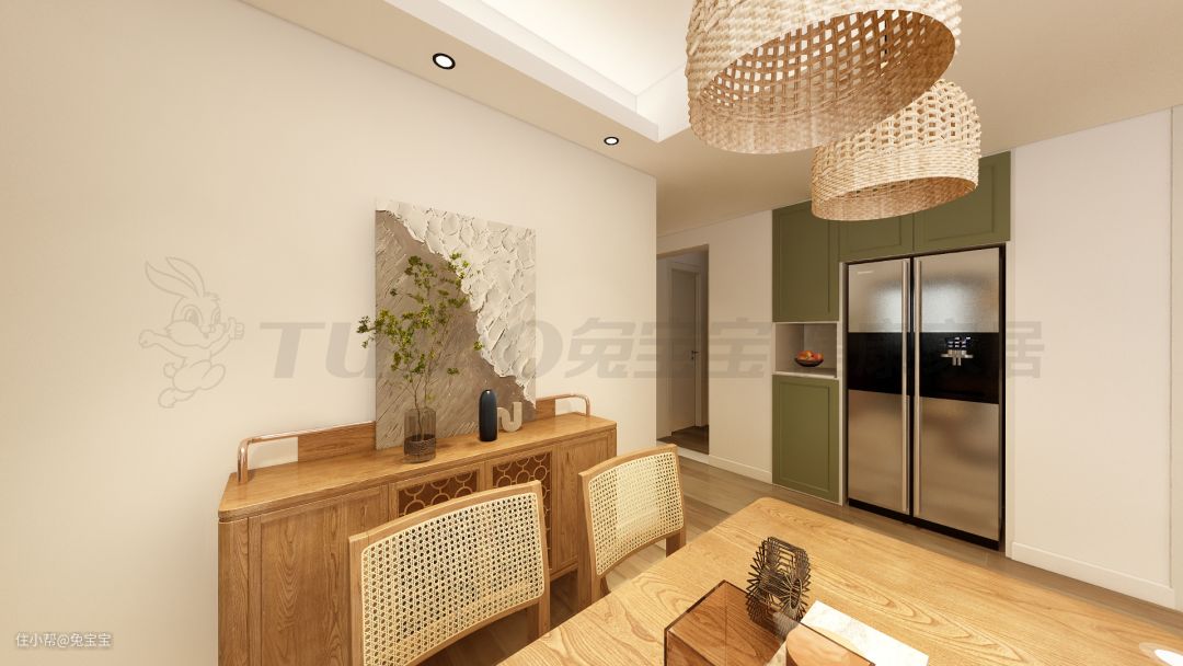 餐边柜选择原木色小斗柜,为过道预留更多的活动空间。