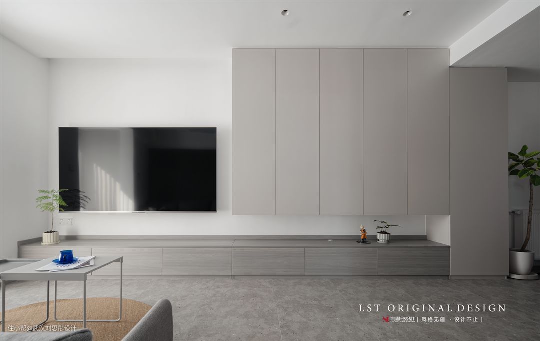 3、客厅拆除阳台门,让空间变得更大更开阔,顺着电视背景墙做了一面电视柜,满足业主一家的收纳需求。