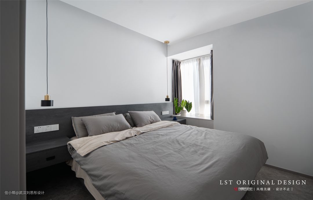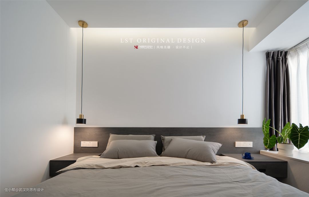 床头柜连接床头板,深灰木色给人的感觉沉稳内敛,搭配上柔和的灯带更是营造了非常舒缓放松的氛围。