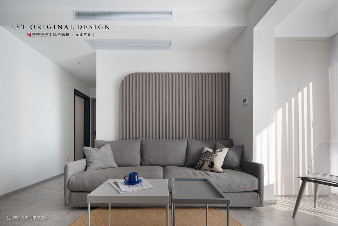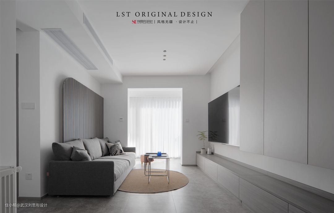 一张圆形的剑麻地毯居于客厅中央进行色调的点缀,避免让大面积的灰色瓷砖显得单调。也能提升空间质感!