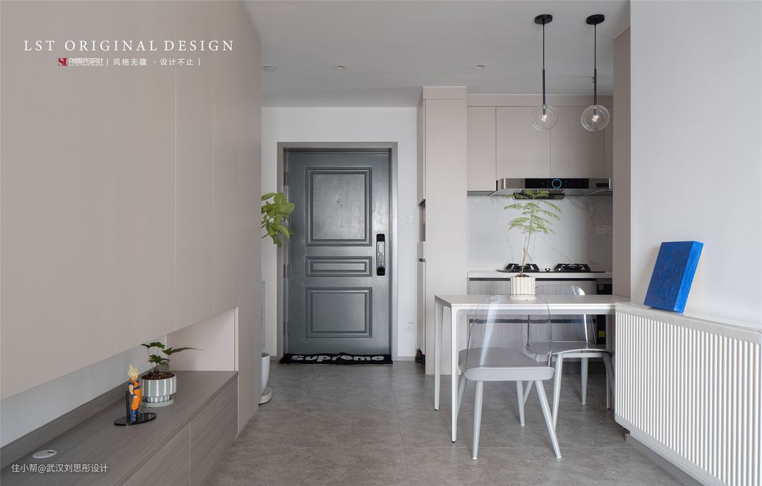 1、厨房打开,L型的布局刚好也能将玄关柜一并加上,这样同时解决了厨房采光和玄关收纳的问题。