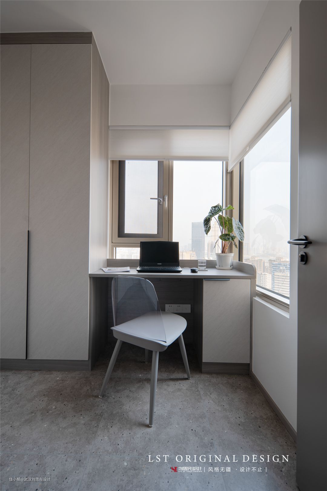 过道尽头的书房同时承接了衣帽间的功能,在原有的窗户下安装书桌,享受到自然充沛的采光与窗外风景,其他位置则是打造顶天立地柜,把收纳做到最大。