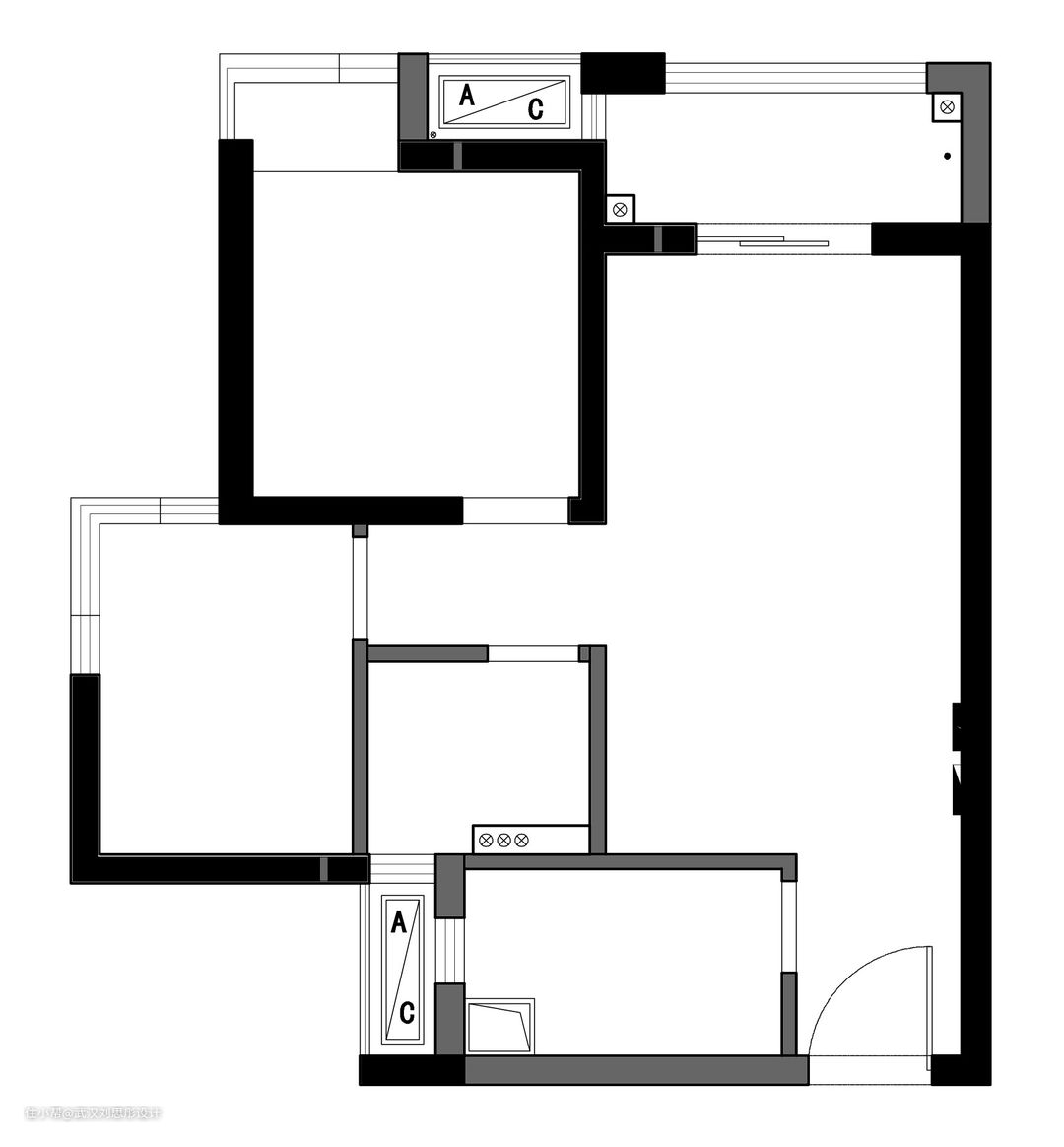 业主是一对年轻的夫妻,为了能离公司更近一点,减少通勤时间,因此选择了这个两室的家,这个户型的优点是大门对阳台,通风效果好,楼层高,采光好。但也存在着两个个比较影响人居住的问题: 1. 厨房、卫生间及所有的房间面积都比较小,每个空间都很难有一个比较舒服的体验感。 2. 厨房的采光很差,进门缺少收纳的空间。