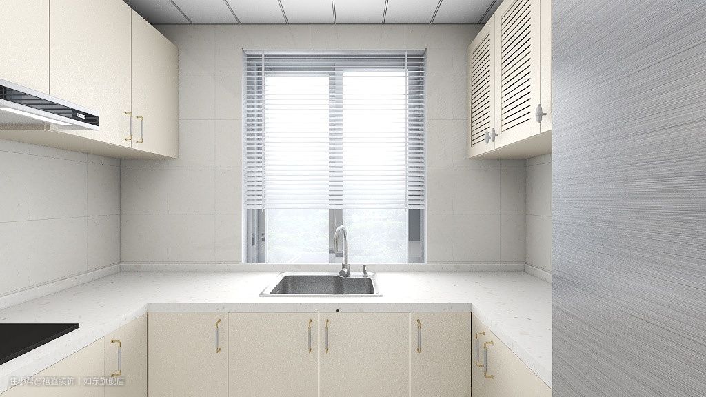 【厨房】厨房设计成回字形,留出足够的空间供下厨者施展厨艺。两侧同色的吊柜和橱柜上下齐整,美观的同时满足厨具等物品的收纳。