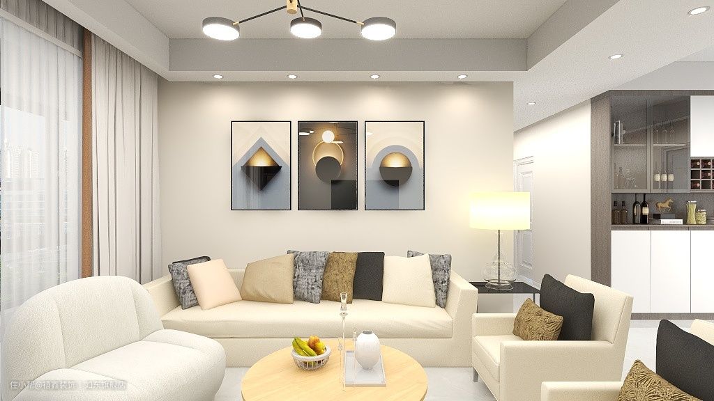 【客厅】奶白色沙发呈现U型布局,主沙发坐镇中心,单人沙发分饰两旁;因为比较低矮,所以显得整洁开阔。深色抱枕点缀,与墙面的挂画相呼应,增添艺术感。