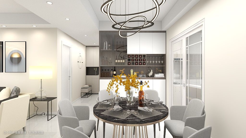 【餐厅】餐厅与客厅之间由过道与横梁作为隔断,黑色岩板圆桌有金属包边,带来轻奢的气息,灰色的餐椅具有包裹感,舒适且高级。餐边柜通顶,满足餐具以及红酒的收纳需求。
