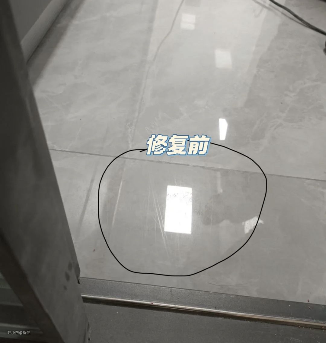 最难处理的是瓷砖破损、砸坑,单一颜色的还好,用接近瓷砖颜色的修补膏,涂在砸坑处,涂的时候尽量涂的高于瓷砖地面,方面晾干后打磨平整。